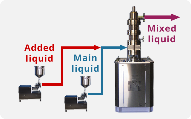 The added liquid (catalyst) instantly disperses. A highly efficient synthesis reaction then takes place instantly. (Example: There is a 97% reaction with an added amount of 1.1-times the theoretical value.) Moreover, the reaction time and stirring strength can be adjusted. This allows the reaction to take place under the optimal conditions for the material.