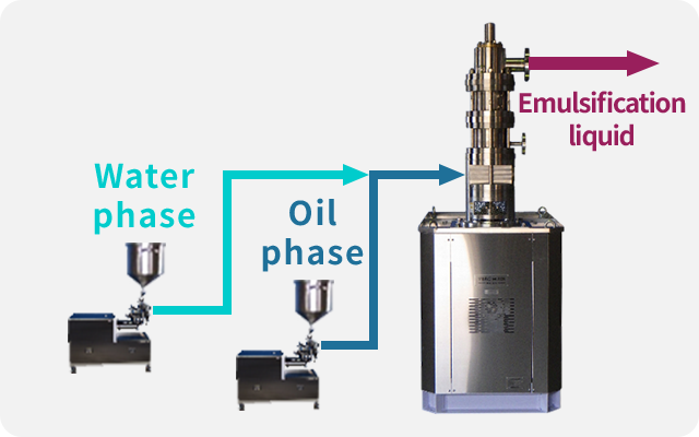 The added liquid (catalyst) instantly disperses. A highly efficient synthesis reaction then takes place instantly. (Example: There is a 97% reaction with an added amount of 1.1-times the theoretical value.) Moreover, the reaction time and stirring strength can be adjusted. This allows the reaction to take place under the optimal conditions for the material.